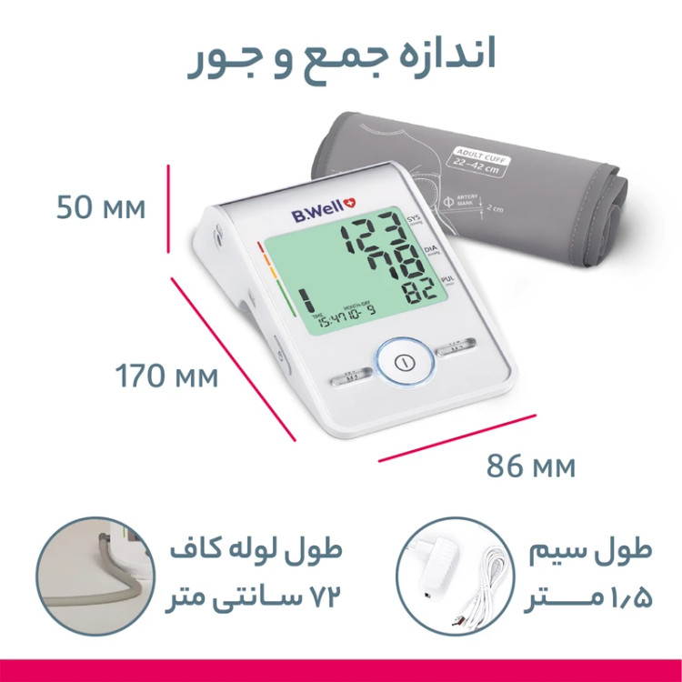 فشارسنج بازویی بی ول مدل MED-55 یکی از نمونههای باکیفیت موجود در بازار است که طراحی و امکانات بسیار خوبی دارد. این فشارسنج قابلیت ذخیرهی اطلاعات فشارخون دو کاربر تا 60 بار اندازهگیری برای هر کدام را دارد و شما میتوانید نتایج ثبت شده در حافظهی دستگاه را با پزشک خود در میان بگذارید تا بررسی وضعیت میزان فشارخون شما در بازههای زمانی مختلف به شکل دقیقتری انجام پذیرد. این دستگاه ضربان قلبتان را هم نمایش میدهد و نماد تشخیص آریتمی آن، شما را از منظم بودن یا نبودن ضربان قلبتان آگاه خواهد کرد. منبع تغذیهی این فشارسنج باتری نیمقلم و یا شارژ از طریق سیم و آداپتور متصل برق شهری است و مصرف آن به اندازهای است که نیازی به تعویض مداوم باتریها یا شارژ مکرر نخواهید داشت. در واقع عمر باتریها یا هر بار شارژ برای دهها بار استفاده از دستگاه پاسخگوست. این فشارسنج از نوع دیجیتالی است و به همین خاطر احتیاجی به استفاده از گوشی پزشکی ندارید. علاوه بر آن، کار با آن بسیار راحت است کافیست دست خود را بر روی سطحی صاف و ترجیحاً هم راستا با قلب قرار دهید و دستگاه را دور بازوی خود ببندید و در کمترین زمان ممکن فشارخون و ضربان قلب شما روی LCD آن نمایش داده خواهد شد.