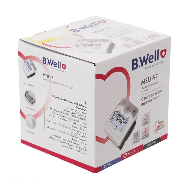 B.Well در سال 2004 میلادی توسط گروهی از پزشکان مقیم لندن تاسیس شد و در مدت زمان کوتاهی توانست اعتماد بسیاری از خانوادههای انگلیسی را به دست آورد و تبدیل به یکی از برندهای رقابتی در اروپا شود. فشارسنج مچی بی ول مدل MED-57 امکان اندازهگیری سریع و قابل اطمینان فشارخون سیستولیک و دیاستولیک و همچنین ضربان قلب را با استفاده از روش نوسانسنجی فراهم میکند. این دستگاه کاملاً خودکار، دیجیتال و مخصوص مچ دست است. این دستگاه دارای فناوری جدید هوش فعال است و از روش نوسانسنجی در حین باد کردن مچبند برای کسب نتیجهی سریع و دقیق استفاده میکند. این دستگاه برای دور مچهایی با اندازهی 13.5 تا 21.5 سانتیمتر مناسب بوده و برای اندازهگیری فشار خون افراد و همچنین برای کسانی که از بیماری فشار خون بالا رنج میبرند و به اندازهگیری مداوم فشار خونشان نیاز دارند، بسیار کاربردی است.