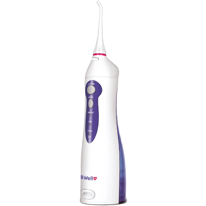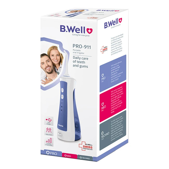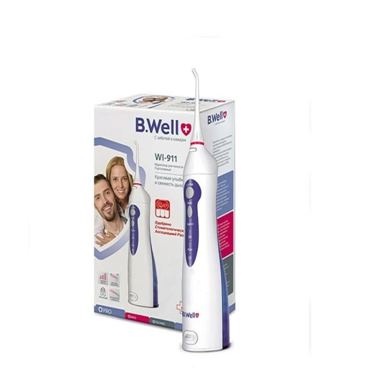 واترجت دندان بی ول مدلWI-911 ، یک واترجت کوچک و کم وزن است و قدرت بسیار بالا در تمیز کردن دندان ها و قابلیت پر شدن مخزن بدون جدا شدن از دستگاه، دارای قابلیت سه حالت عملکرد نرمال(شست وشوی معمولی)، نرم(شستوشوی ملایم لثه های حساس)، پالس(شست و شوی لثه) و دارای باتری لیتیومی که قابلیت نگهداری شارژ و کار با دستگاه تا8 ساعت دارد . واترجت دندان B.WELL، ساخت سوئیس است، ظرفیت مخزن : 150 میلی لیتر، دارای باتری لیتیومی قابل شارژ،قابلت چرخش 360 درجه ، دارای 2 نازل استاندارد، عملکردی بسیار کم صدا،دارای عملکرد ضربه ای و نرم، دارای قابلیت و سیستم خاموشی خودکار موتور، در صورت عدم استفاده بعد از (2) دقیقه، دارای طراحی مخصوص جهت پاکسازی دندان ها با پاشیدن آب به تمام نقاط دهان و دندان، دارای نازل جهت پاکسازی واترجت، پاکسازی زبان، پریودنتال (برای لثه)، ارتودنسی (برای بریس ها) وسیله ای کاربدی جهت افزایش بهداشت دهان و دندان، جلوگیری از پوسیدگی، فاسد شدن و خرابی دندان می باشد.