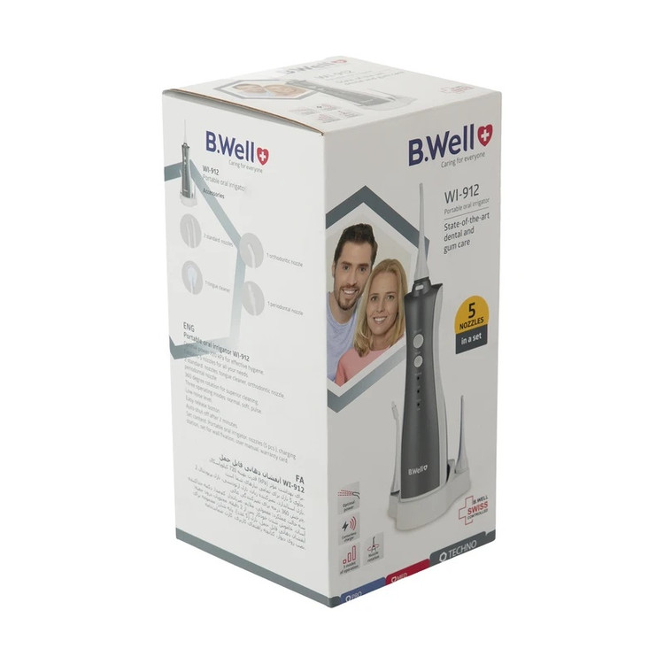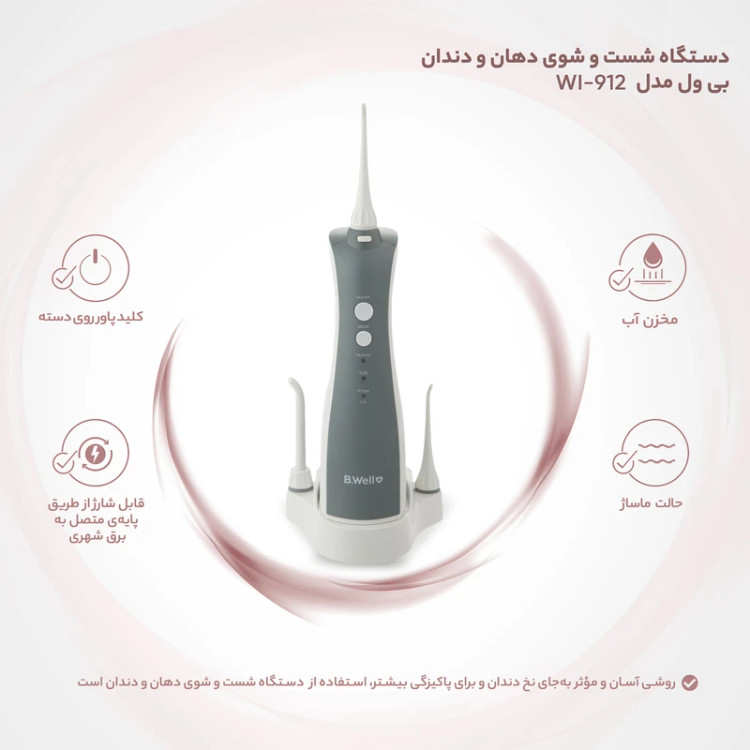 این روزها با توجه به اینکه عموم مردم بهصورت روزانه از مسواک استفاده میکنند، با این حال بسیاری از آنها دچار بیماریهای لثه و بافت نگهدارنده دندانی میباشند که پیشزمینهای برای ایجاد بوی بد دهان و حتی از دست دادن دندان است. برای جلوگیری از ایجاد بیماریهای لثه، متخصصین دهان و دندان استفاده از نخ دندان بهصورت روزانه را توصیه میکنند. اما استفاده از نخ دندان سخت و وقتگیر است. روشی آسان و مؤثر بهجای نخ دندان و برای پاکیزگی بیشتر، استفاده از دستگاههای دستگاه شست و شوی دهان و دندان مانند دستگاه بی ول مدل WI-912 است. این محصول دارای پنج نازل با کاربردهای مختلف است و طریق پایهای متصل به برق شهری، شارژ میشود. وزن و ابعاد این کالا نسبت به نمونههای دیگر کمتر است به همین خاطر برای استفاده در سفر هم گزینهای مناسب است و حمل و نقل آن آسان است. دکمهی پاور و تنظیمات این محصول بر روی دستهی آن قرار گرفته و به دلیل جدا بودن آن از استند، استفادهی سادهتر و راحتتری دارد. این دستگاه دارای پنج نازل و بدنهای پلاستیکی است و برای بهداشت دهان و دندان کسانی که ارتودنسی کردهاند هم از بهترین گزینههای موجود در بازار است. نازل پریودنتال این دستگاه، برای شست و شوی لثهها مناسب بوده و حس تازگی و پاکیزگی را به کاربر میبخشد. همچنین بسیاری از مردم هنوز فکر میکنند استفاده از مسواک و نخ دندان کافیست و به همین خاطر به شستشو و سلامت زبان توجهی نمیکنند. حسن این دستگاه برخورداری آن از نازل تمیزکنندهی زبان است که این قابلیت، ویژگی مهمی در محصولات این حوزه است.