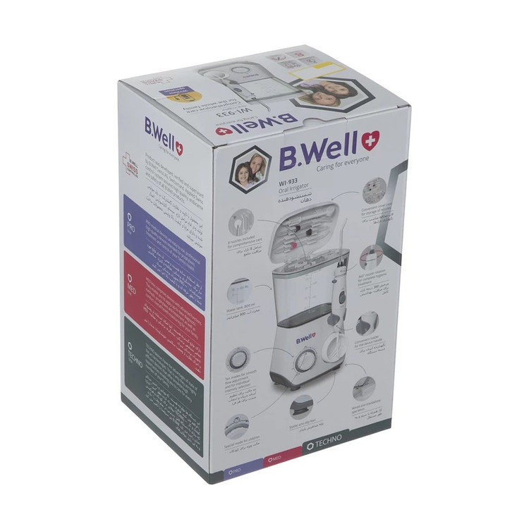 دستگاه شست و شوی دهان و دندان بی ول مدل WI-933 با قابلیت تمیز کردن قوی به حفظ سلامتی دندان، زبان و لثههای شما کمک میکند. این شستشو دهنده با بکارگیری ترکیبی از جریان پرفشار و جهندهی آب به از بین بردن باکتریهای مضر از نواحی عمیق بین دندانی و زیر خط لثه که نمیتوان با مسواک به آنها دسترسی پیدا کرد، کمک میکند. این دستگاه دارای هشت نازل برای تمامی نیازهای مصرفکننده است که این هشت نازل عبارتاند از: 3 نازل استاندارد برای مراقبت از دهان، نازل تمیزکننده زبان، نازل ارتودنسی(برای براکتهای دندانها و شکاف بین دندانها)، نازل برای ایمپلنت(پل، تاج و روکش دندان) ، نازل پریودنتال(برای لثهها و دندانهای مصنوعی) و نازل مسواک. این دستگاه دارای پایهی ثابت بدون لغزش، نازل با قابلیت چرخش 360 درجه، نگهدارندهی مناسب برای دستهی دستگاه و یک کلید پیچشی کنترل برای تنظیم میزان شدت عملکرد دستگاه در ده حالت مختلف است.