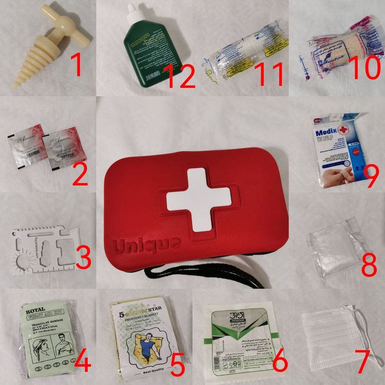 گاز استریل، ماسک، پد الکلی، چسب زخم، باند سوختگی، فک بازکن، باند کشی، بتادین، بانداژ مثلثی، پتوی نجات، آچار کارتی همه کاره